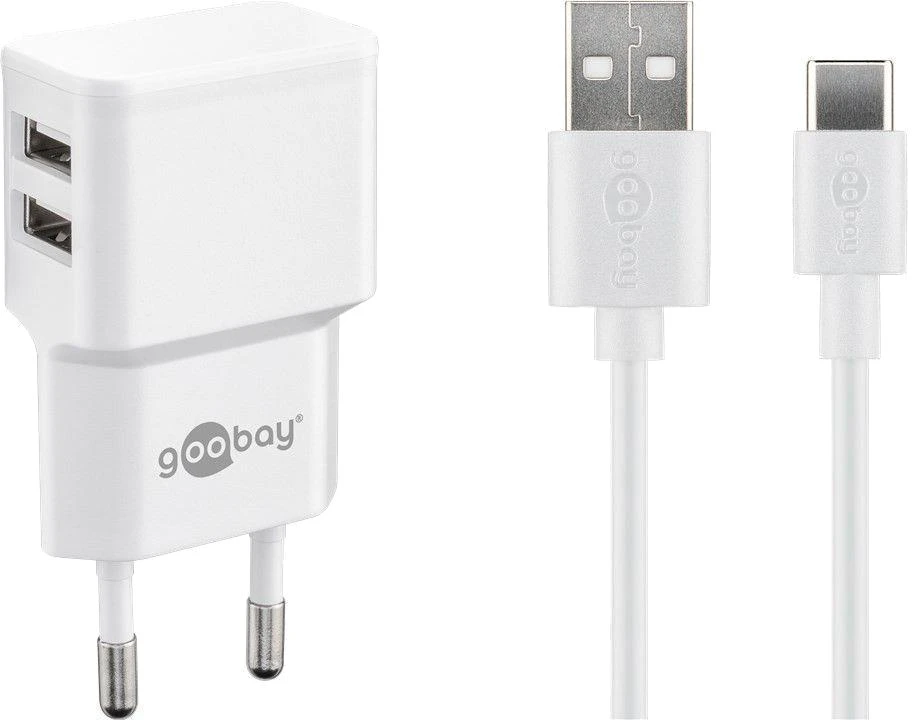 Das Goobay-Dual-USB-C-Ladeset verfügt über ein USB-Ladegerät mit 2x Typ A-Anschlüssen und 1,0 m langes USB-C-Kabel.
