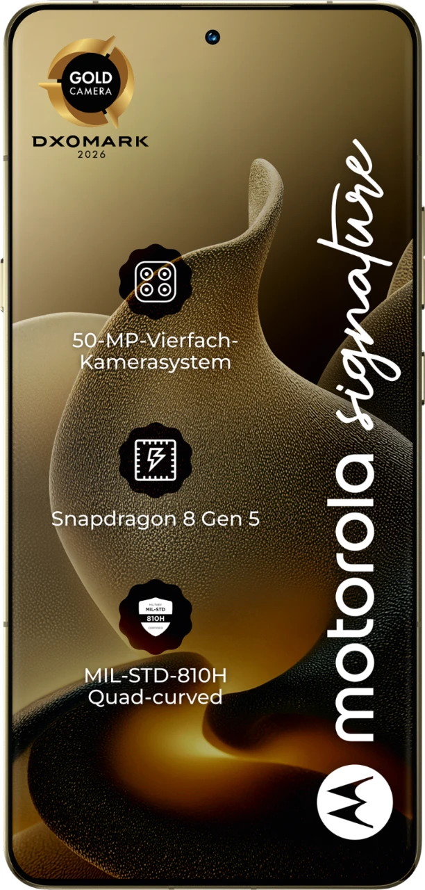 Wir präsentieren die brandneue motorola signature-Serie – eine sinnvolle Kombination aus Technologie und Design, die die Motorola-DNA widerspiegelt. Angefangen bei den konturierten Kanten und einem ultraflachen Profil, das so gestaltet ist, dass es die raffinierteste Silhouette bildet, bis hin zum Aluminium im gesamten Rahmen, das für mehr Eleganz und Widerstandsfähigkeit verwendet wird. In Kombination mit einzigartigen Oberflächen und Materialien ergibt sich ein sensorisches Erlebnis, das unvergleichlich ist. Im Inneren bieten motorola signature-Geräte ultimative Leistung, die mit dem DXOMARK Gold Label für höchste Standards in Sachen Bildqualität ausgezeichnet wurde. Mit Sony LYTIA-Sensoren, Dolby Vision-Aufnahme und dem Snapdragon 8 Gen 5 Prozessor der nächsten Generation hast du die nötige Leistung, um Momente wie nie zuvor einzufangen. Mit exklusiven, maßgeschneiderten Services und bis zu sieben Jahren Betriebssystem- und Sicherheitsupdates wird dein Gesamterlebnis aufgewertet.1 Erwarte das Beste von motorola signature